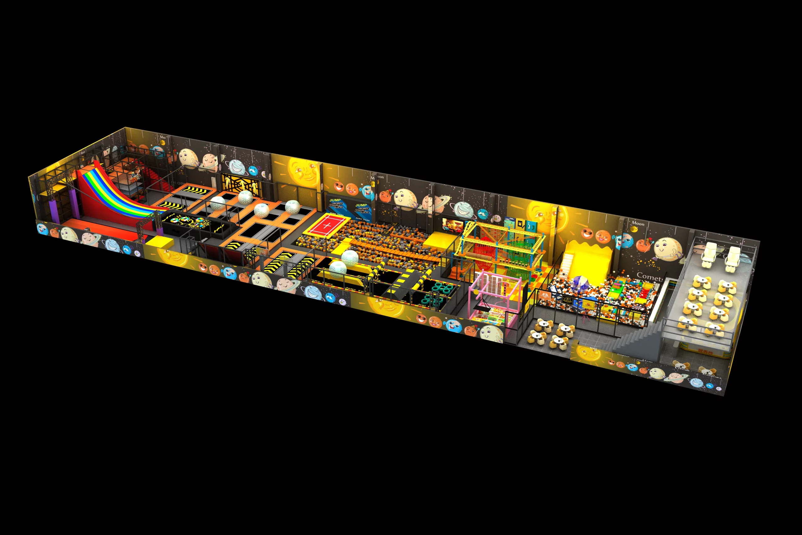 Сердцем нашей игровой площадки является батутная зона, предлагающая множество зон для прыжков, где дети могут подпрыгивать, делать сальто и взлетать на новую высоту. Эта безопасная и увлекательная среда поощряет физическую активность, позволяя детям выразить себя через движение. Благодаря большому пространству для прыжков и игр батутная зона идеально подходит для энергичных детей, ищущих приключений.